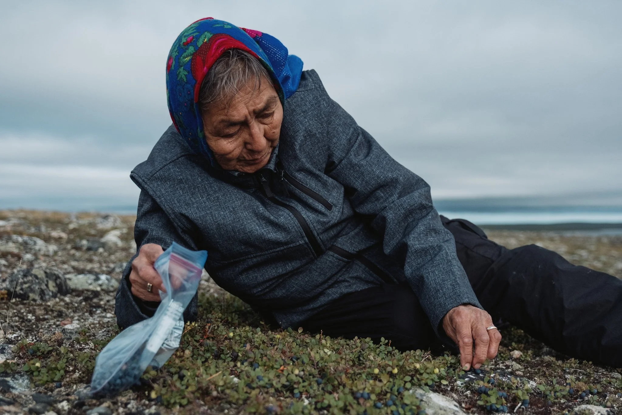 Therese Zoe picks wild blueberries near the Koketi camp.