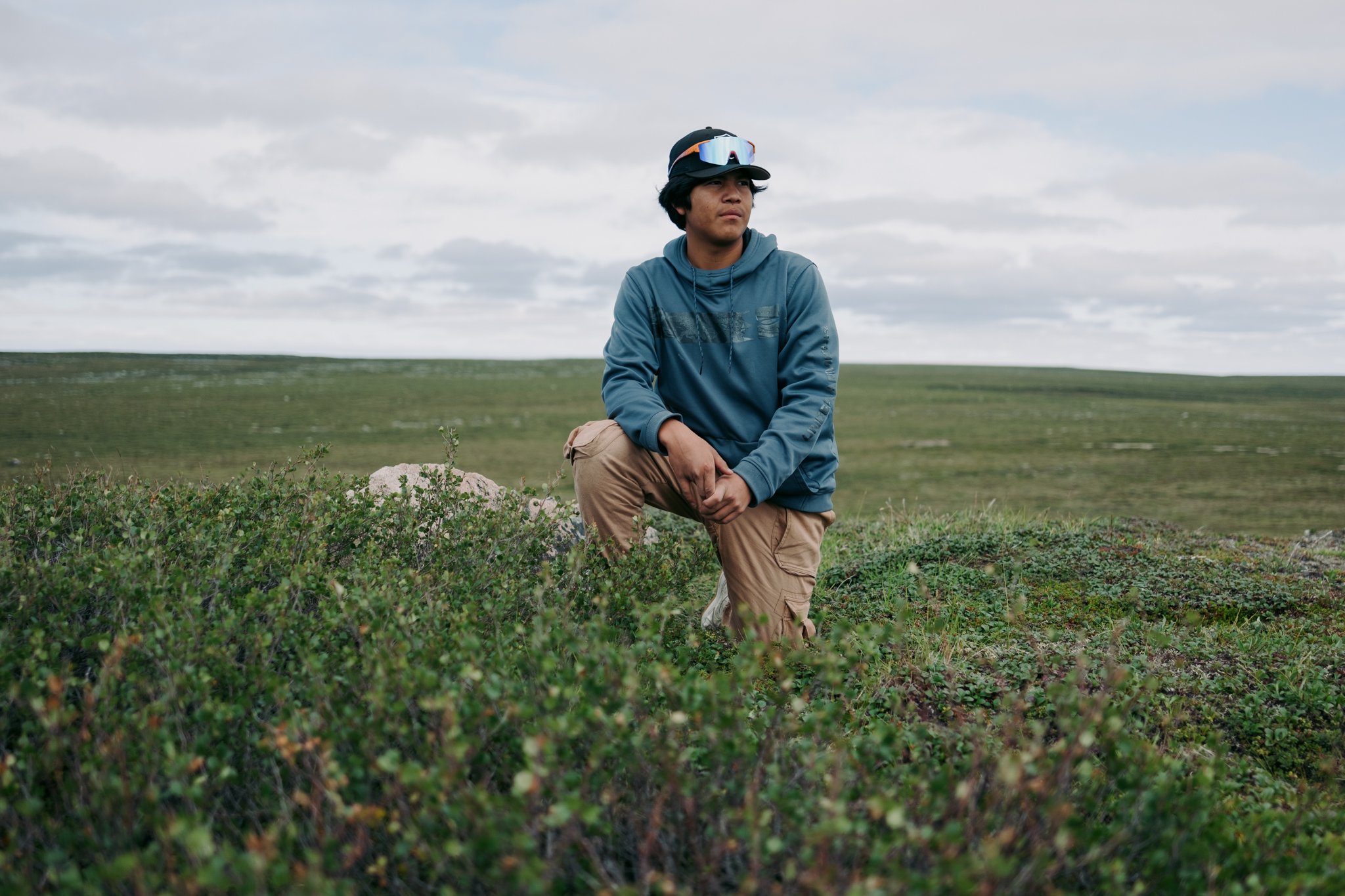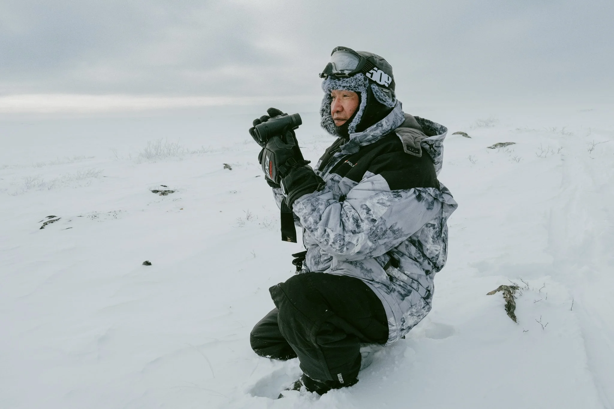 Lloyd Rabesca scouts the landscape in search of caribou at Lac de Sauvage, near the Ekati diamond mine.